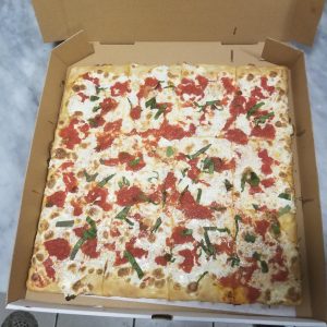 Pomodoro Sauce, Fresh Mozzarella and Fresh Basil on a Thin Square Crust