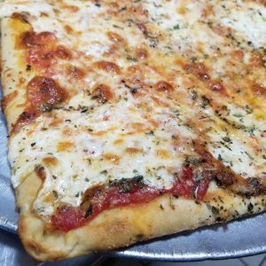 Pizza Sauce, Shredded and Fresh Mozzarella, Parmesan Cheese and Oregano on a Thin Square Crust